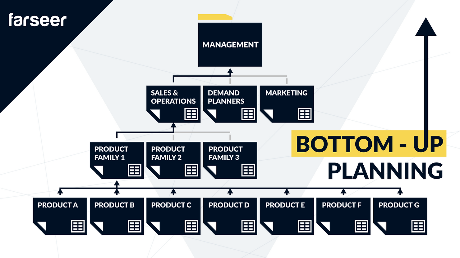 Why is everyone talking about bottom-up vs top-down forecasting? What are they? Are they crucial in the context of demand planning? How do bottom-up vs top-down forecasting compare? Roughly speaking, in the top-down approach, the management sets the goals and passes them down the line, and in the bottom-up, employees from the lower parts of the organization send the information upwards.