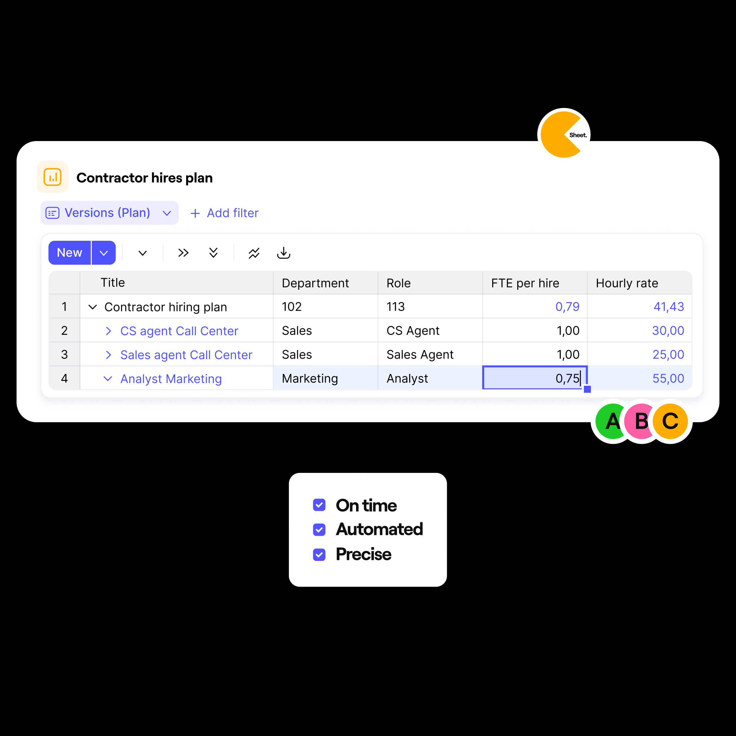 Yes. Farseer lets you plan contractor capacity by FTE, project, or department and see the cost impact on budgets instantly. Adjust external workforce assumptions like rates, volumes, or durations in real time, with automatic budget recalculation — so you maintain full financial visibility across both employees and contractors.