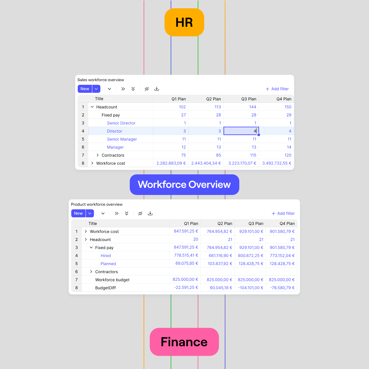 Connect HR and finance in one model, adjust hiring or compensation assumptions, and instantly see the budget impact.